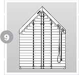 Stahlseile, kunststoffummantelt, UV-stabilisiert, Durchmesser 1,0 mm, verbunden durch Stahlzugfeder für dauerhafte Spannung, Abspannung mit Spannschuhen/Spannwinkeln aus schlagfestem Kunststoff, glasklar.